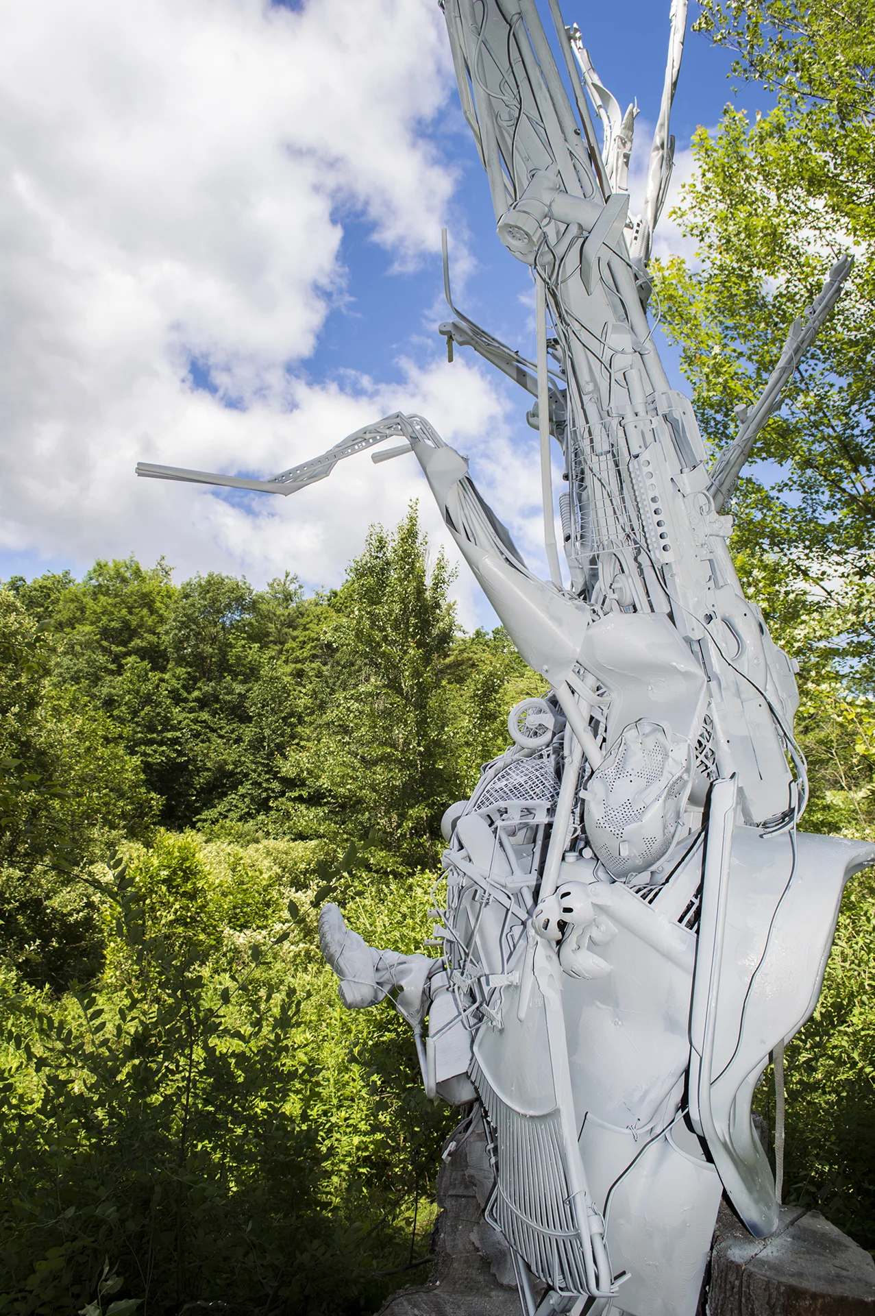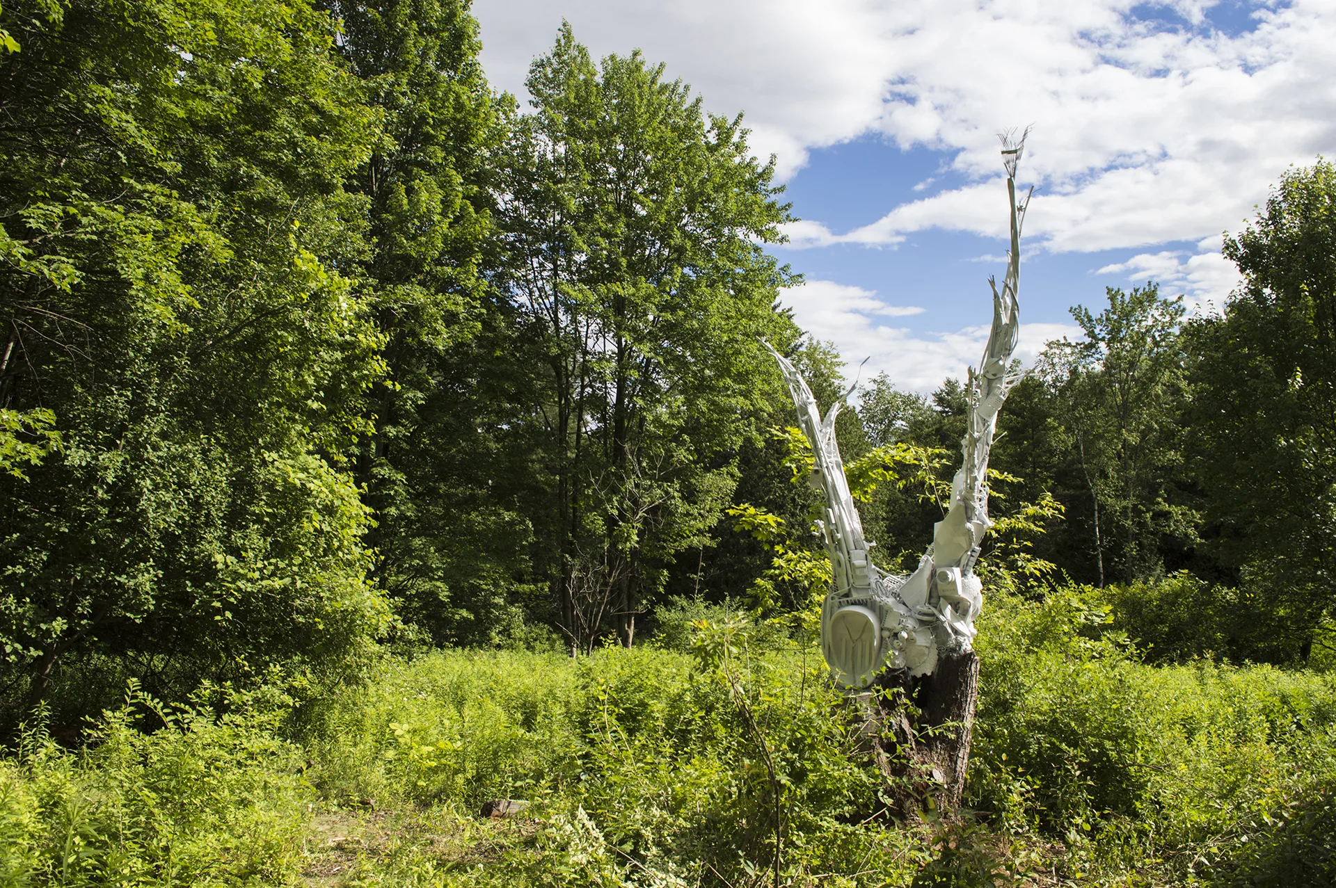 Manifestation utilizes old products destined for the landfill to create a ghostly apparition of consumerism. The assembled form of the products is characterized by growth. Mimicking the forested landscape it occupies, positions the sculpture both as nature and in opposition to nature. The sculpture plays with the conception of value with the ultimate transmutation of trash to art, creating a counter narrative to the typical cycle of production - consumption - waste.